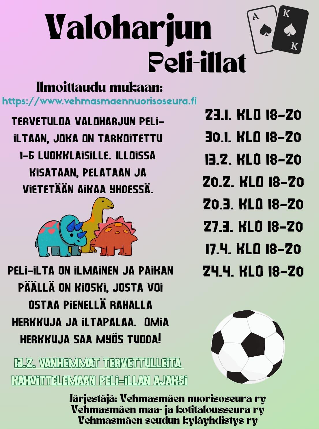 Alakouluikäisten Peli-illat alkavat Valoharjulla: Ensimmäinen peli-illat on 23.01.klo 18-20. Peli-iltoihin tulee ilmoittautua oheisen linkin kautta, jokaiseen kertaan ei tarvitse eri ilmoitusta.