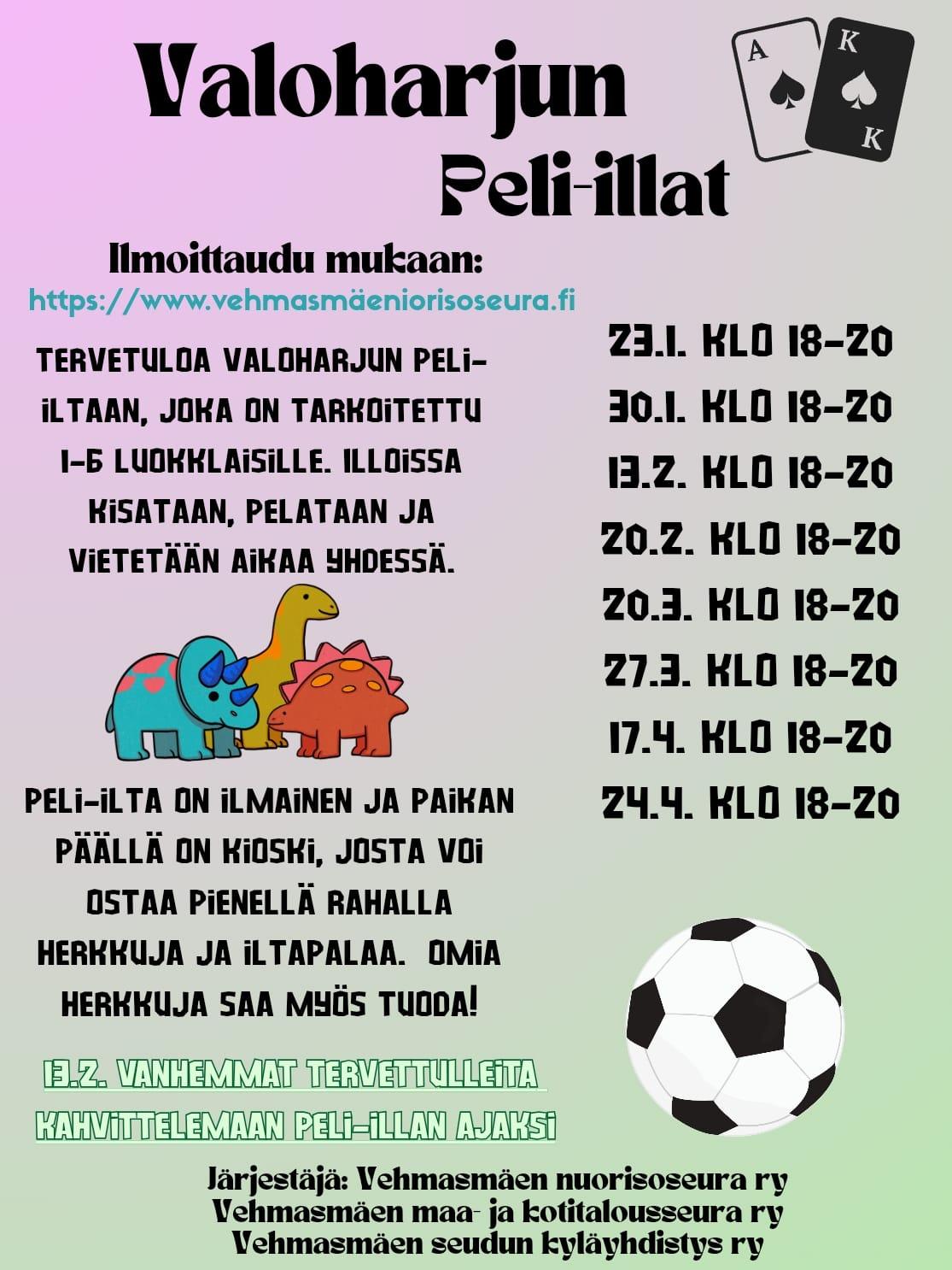 Alakouluikäisten Peli-illat alkavat Valoharjulla: Ensimmäinen peli-illat on 23.01.klo 18-20. Peli-iltoihin tulee ilmoittautua oheisen linkin kautta, jokaiseen kertaan ei tarvitse eri ilmoitusta.